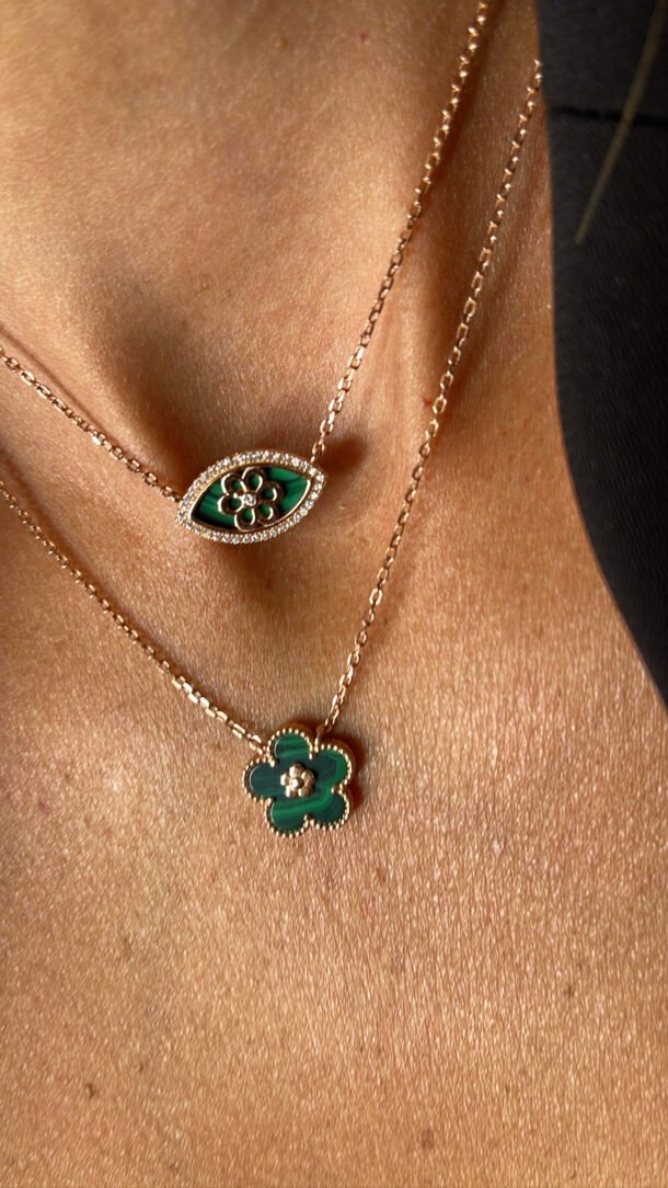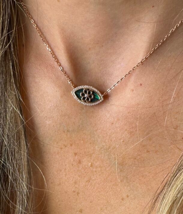 שרשרת עין פרח בשילוב אבן מלכית ירוקה, מכסף טהור 925 בציפוי רוז גולד, משובצת זרקונים.