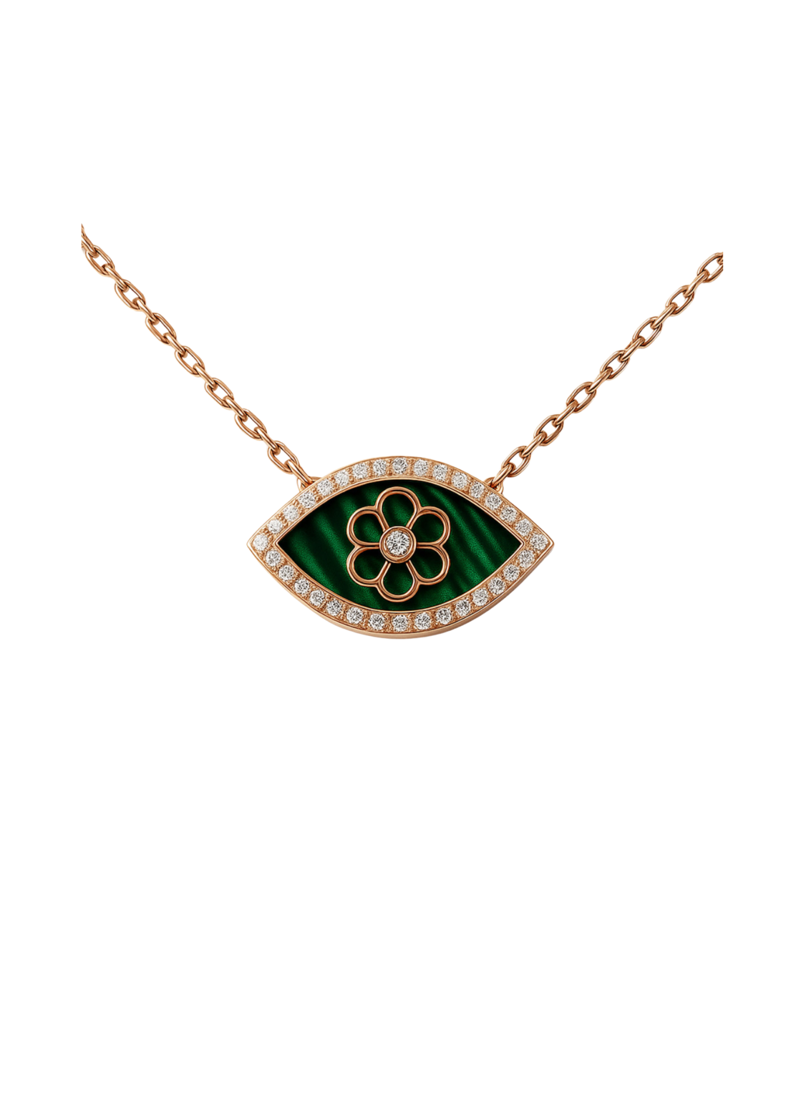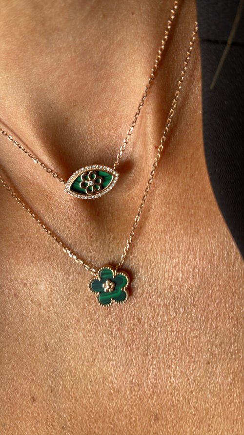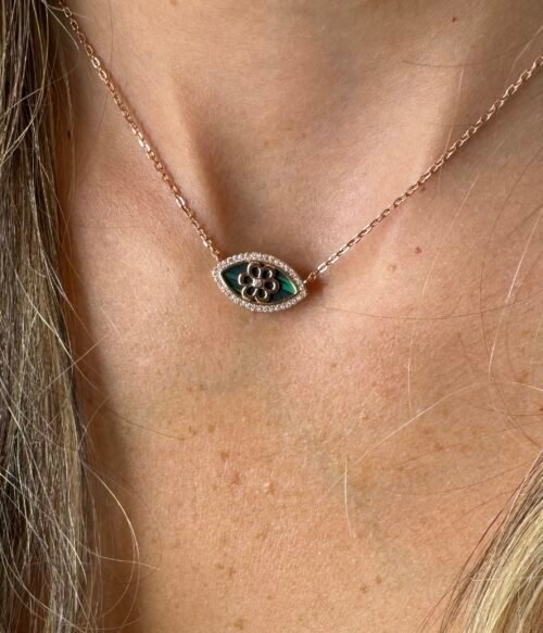 שרשרת עין פרח בשילוב אבן מלכית ירוקה, מכסף טהור 925 בציפוי רוז גולד, משובצת זרקונים.