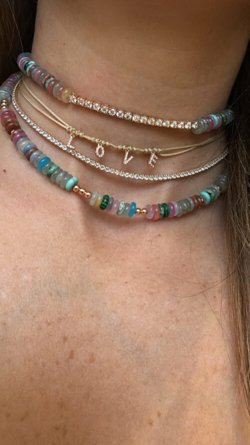 שרשרת קולר חוט טבעי עם LOVE מכסף טהור 925 בציפוי רוז גולד, משובצת זרקונים .